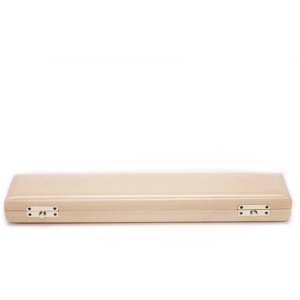 Other essential features of the TJ Chanson 958 flute include a heavy-weight headjoint crown, pointed key arms, open-hole keys, B-footjoint, offset G key, deluxe pads, and a cherry wood French-style case with a fleece-lined cover.